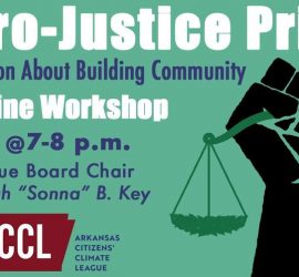 Arkansas Citizens’ Climate LeagueMonday Sept 14 – 7:00-8:00 pm on ZoomSign Up Now Open for Enviro-Justice Virtual Event!Registration is now open for our online event “Enviro-Justice Primer: A Conversation About Building Community” from 7-8 p.m. Sept. 14 via Zoom! This online workshop will give an overview of the history of the environmental justice movement, and a look at practical tools and techniques that we can use to help us better engage environmental justice issues. The event is free and open to anyone who registers! Donations can also easily be made while signing up and help to make educational programming like […]