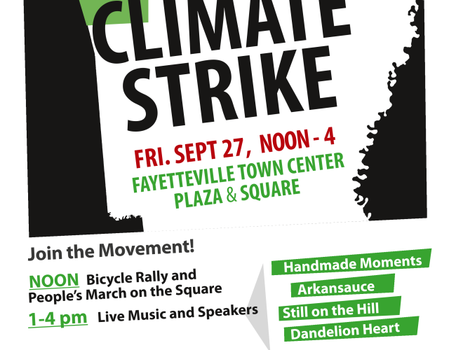 In coordination with the global Earth Strike organized by 350.org and many other climate action groups, including Greta Thunburg’s youth group. A great program of performers has already agreed to participate, and this will be an alternative for Fayettevillians who want a different option than Bikes Blues & BBQ (which is the same weekend). (Farmers Market folks tell us BBBBQ people don’t frequent the Square).