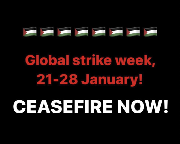We know that a week is a long ask and that many of us have complex lives that cannot be put on hold, so we ask that you just participate in the strike to the best of your ability. And please be loud about it! Tell everyone why you have to cancel the meeting, why you are taking a day off, why you are stocking up on gas and groceries on the 20th, etc. Tell everyone that life cannot go on as usual while war crimes are committed in our name!