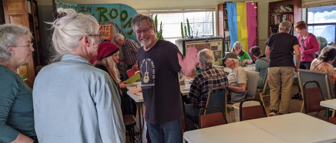 Here’s Donna Mulhollan lost in a crowd of people attending her postcard writing party at Omni Thursday night. They did 200 cards to make changes in Washington DC. If you need action, come to the Indivisible meeting Saturday and find your place.