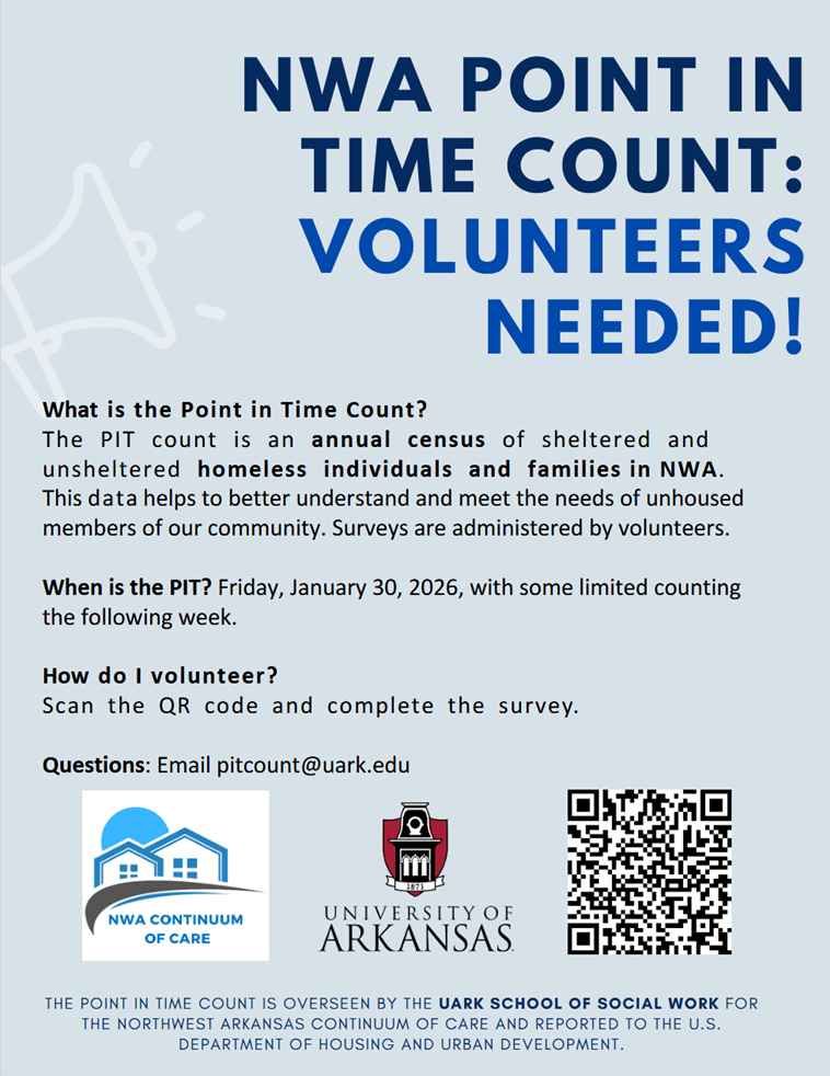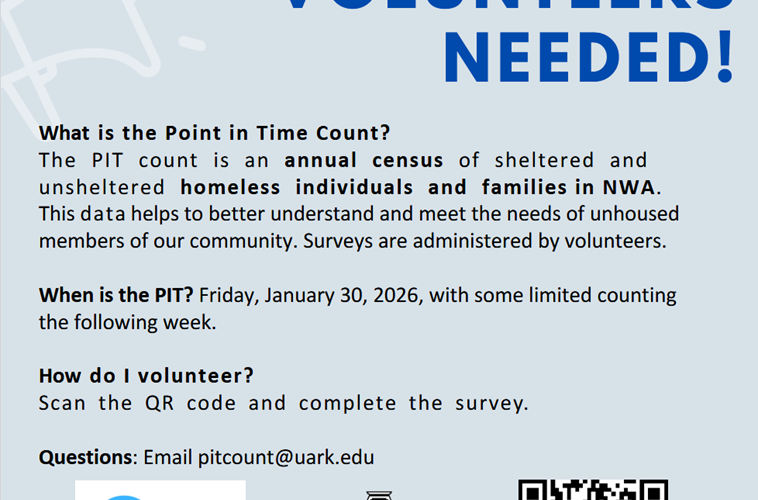 The PIT count is an annual census of sheltered and unsheltered homeless individuals and families in NWA.