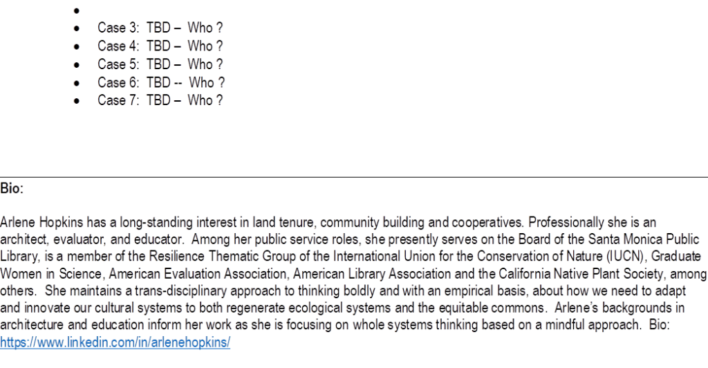Geoff will focus on five books by authors he has worked with, each of which presents clear-eyed hopeful approaches to strengthening environmental harmony in the face of catastrophic climate change: Paul Hawken’s Drawdown, Albert Bates’ Burn (on biochar) and Transforming Plastics, Thomas J. Gorerau, editor, Innovative Systems of Marine Ecosystem Restoration, and Daniel C. Wahl’s Designing Regenerative Cultures.”