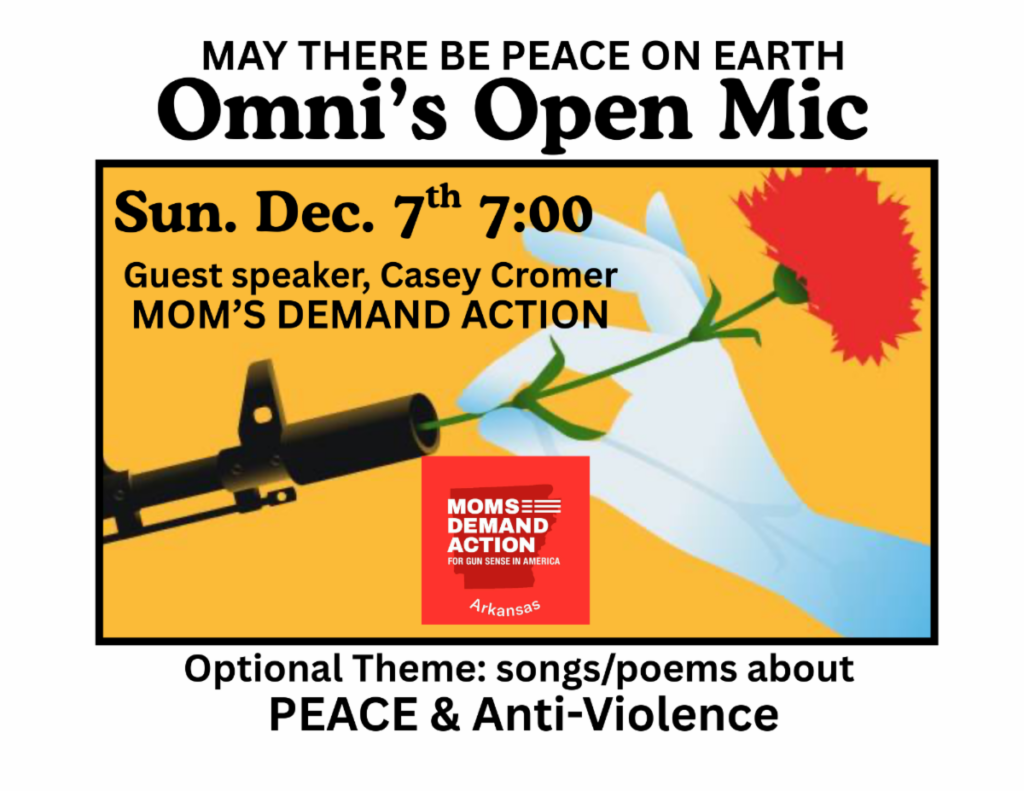 Casey Cromer, Arkansas Lead for Mom’s Demand Action, will join Omni creatives at Open Mic this month. Casey is dedicated and determined to get past the status quo about gun violence and make the world safe for her children, and everybody’s children. Come see what she has to say with a background of good music!