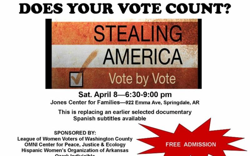 Stealing America Vote By VoteApril 1, 2017 in Justice Stealing America Vote By Vote Movie showing and discussion Sat April 8 – 6:00 pm at Jones Center, Springdale